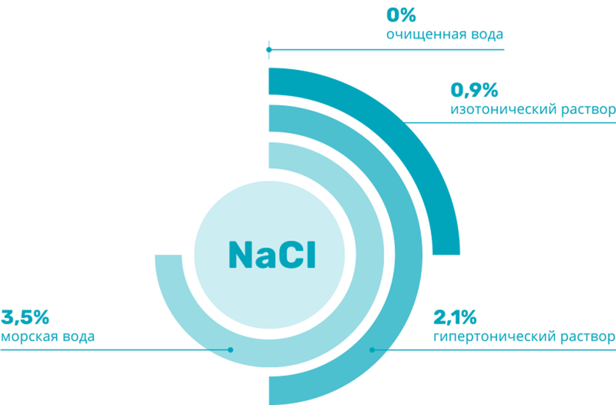 Раствор создает разницу концентраций на поверхности и внутри клеток слизистой оболочки носа. Происходит перемещение жидкости из клеток в межклеточное пространство. Отек слизистой уменьшается.
